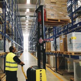 Xe nâng xếp dỡ hàng hóa cao trong kho có lối đi hẹp,